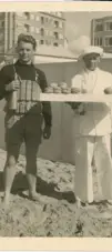 Veel meer weet ik daar niet over, ik was toen nog kind. Ik weet dat aan de hand van de fotootjes, en mijn moeder zei altijd “Papa leurde toen met chococrème op het strand.” Dat zijn fotootjes uit de jaren 37-38. Je kan dat zien aan de kledij die ze aanhadden, zoals de pet van die persoon. Als ik de foto’s bekijk, verkocht hij denk ik ook al boules voor de oorlog. Op deze foto (FOTO 2) zie je Miel Stubbe, mijn vader Alidoor Duynslaeger en Pros Monballieu.