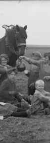 vrouw, die met een karretje op de dijk stond – zij verkocht ook cème op de dijk. Op deze foto zie je mijn kinderen die mij bevoorraadden op het strand.