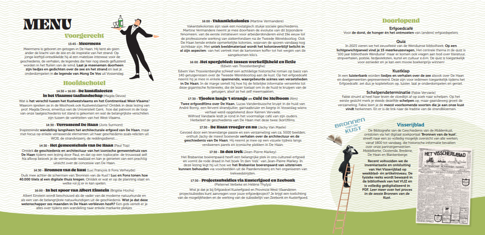 Voor de vijfde editie van het Erfgoedcafé, ons jaarlijks netwerkevent, ben je op zaterdag 18 oktober welkom in het ontmoetingscentrum d' Annexe in De Haan. Je mag je verwachten aan een boeiende namiddag met een mix van lezingen, workshops, rondleidingen én muziek. Deze editie organiseert Erfgoedcel Kusterfgoed samen met de dienst Cultuur van De Haan en de bibliotheek van De Haan.